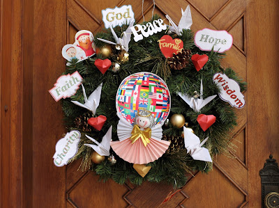 Nessa guirlanda em formato de coração com dois degraus colocamos os bichos e as folha em que se apoiam os tsurus e algumas folhas douradas que tiramos da guirlanda anterior. Por falar nisso a tradicionalíssima guirlanda "chinesa" foi adquirida no SAM'S.