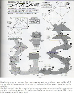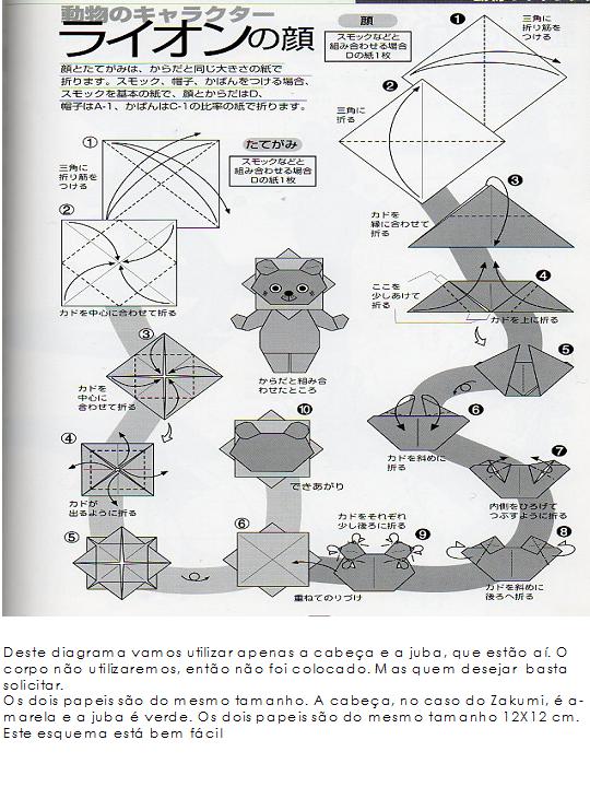 1- Serão necessarios dois papeis quadrados de 15 cm e 1 quadrado de 7,5 cm. No modelo temos um grande laranja e o pequeno laranja. O outro quadrado grande marrom para a juba.2- Toda vez que seguir um esquema verifique se o que você está vendo é o mesmo que a figura indica. Preste a atebnção se o quadrado está na diagonal, quando deve ser virado, com aquelas flechinhas torcidas.3- Na figura 4 do corpo do leão você fará a dobra como manda a figura 3 e depois dobrará o papel como uma prega para dentro.4- Na figura 8 a parte abaixo da linha de base (do triângulo) será dobrada para dentro entre os dois lados do corpo do leão. Até que é fácil, pois é apenas dobrar e introduzir. A figura 12 tem a ultima dobra para o rabinho.5- Na figura 13 há uma flecha gordinha, que parece rabo de estrela, que indica que aquele ponto do diagrama está ampliado para melhor verificação. Abra a pontinha do triangulo. É fácil.