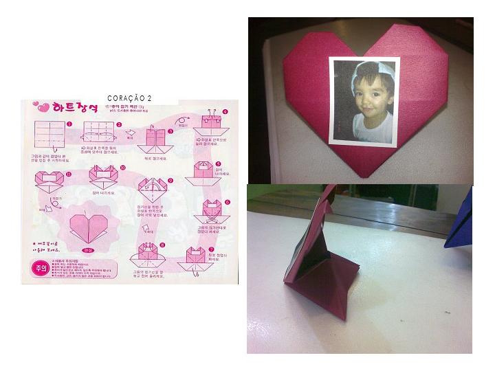 O CORAÇÃO 2 é um pouco mais complicado, mas em compensação ele fica em pé, apoiado em sua propria base e dá até para colocar alguma fotinho meio encaixada na fissura central ou colada, como a do Chico, com o origami como moldura. Nas fotos mostramos de frente e no inverso para que notem no passo 9 quando se coloca uma das abas dentro da outra e que formará a espécie de tripé que manteerá o origami em pé.