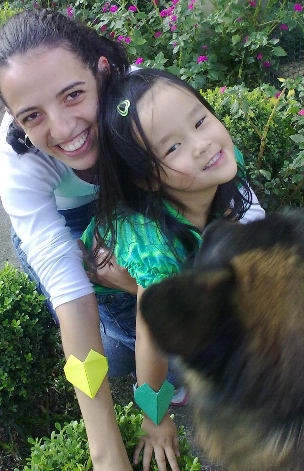 Ao lado Letícia, sua babá Denise com braceletes de coração e Beto de costas, orelha e fucinho, apenas.