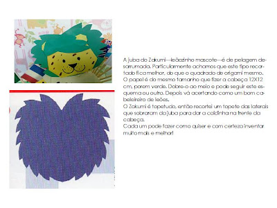 Em primeiro lugar poderia se fazer apenas a cabeça do leãozinho e lhe colocar uma juba verde. Para isto temos o modelo de cabeça e as duas jubas - recortada e de origami da mesma página.Para o Zakumi integral fizemos algumas adaptações, inclusive algo um pouco fora de origamis - cortar alguns detalhes como fizemos com calção braços e pernas.