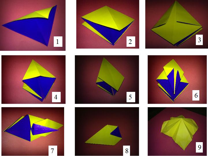 Para treinar faça com papel de duas cores e verá que começa a fazer de uma cor e depois da desdobradura para coninuar fará do outro lado do papel.