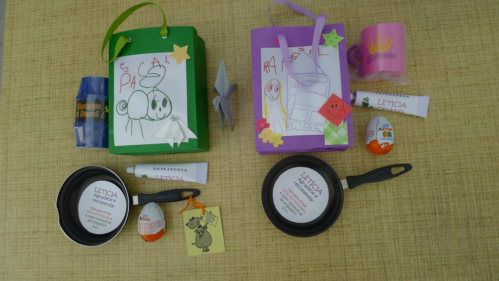 Ambas as sacolas tinha um frigideirinha, de verdade (t-fall), um ovo kinder e uma bisnaga de brigadeiro da BRIGADERIA DA LETÍCIA. A Helô, mãe da Letícia, fez o brigadeiro e com as bisnagas compradas na Barra Doce e etiqueta feita em casa fizemos os brigadeiros e por excesso de precaução colocamos como data de validade o dia seguinte da festa, mas na realidade eles teriam duração de 7 dias. Portanto poderiam ser consumidos até pelo menos dia 30.